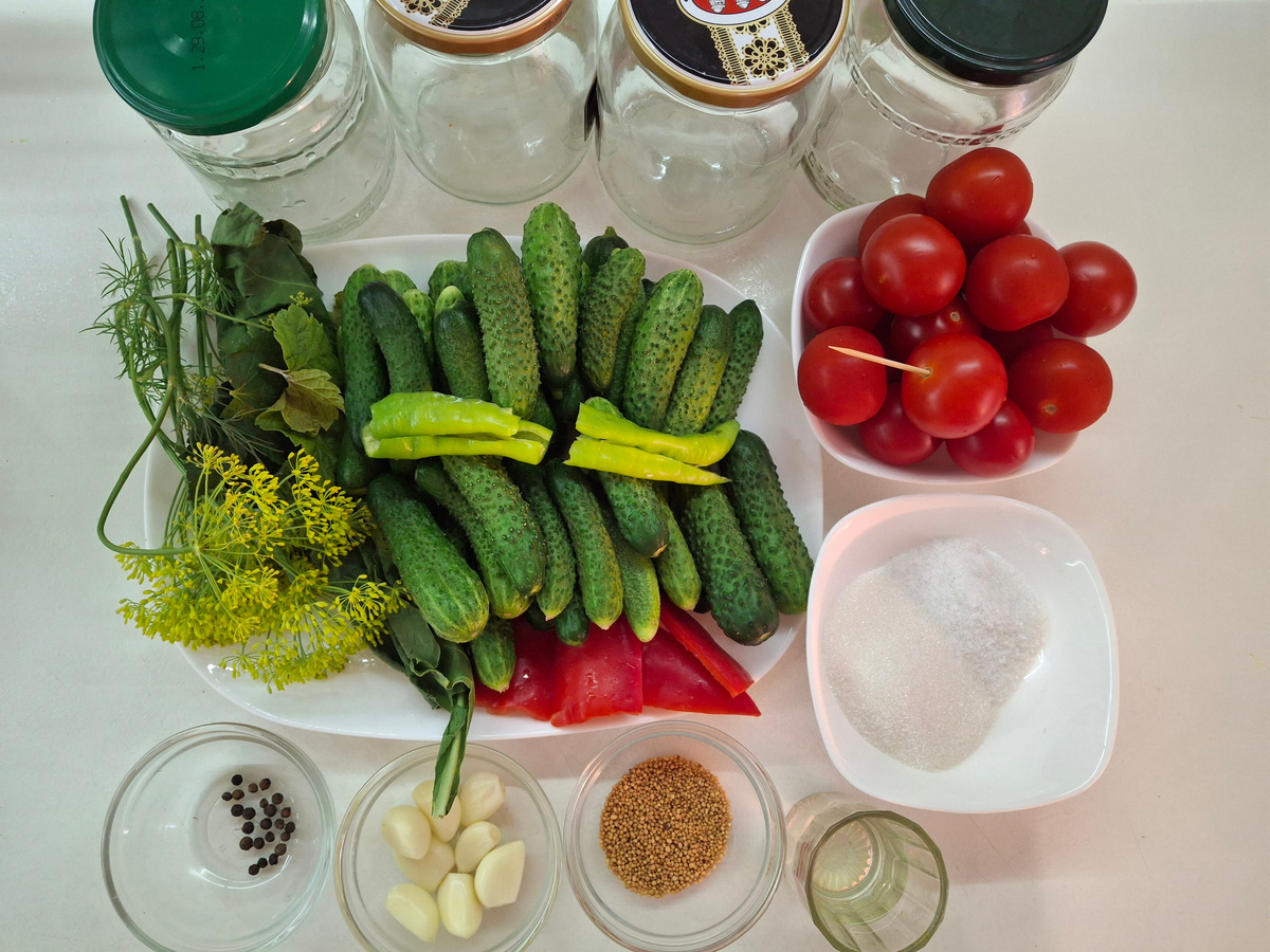 Ассорти из помидор и огурцов. Консервация на зиму.Обычно ассорти закатывают в 2-3х литровых банках. Я закрыла 4 банки по 720 гр.