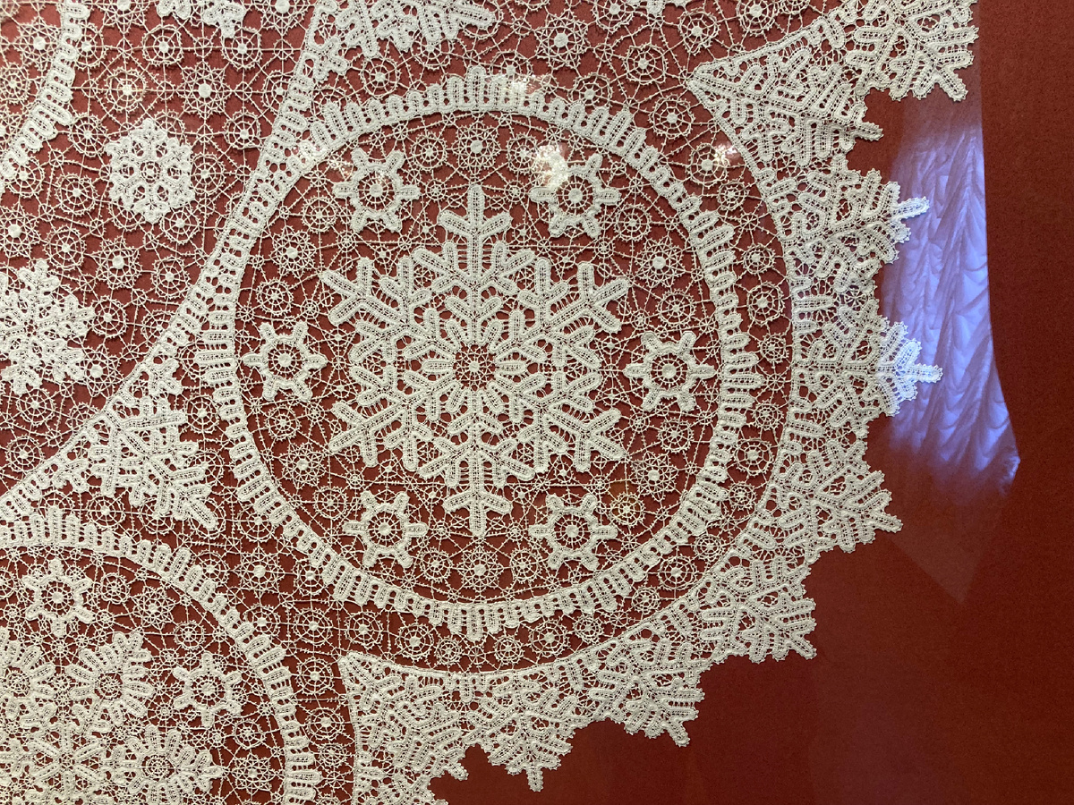 В Вологде есть не только деревянные кружева, но и знаменитое кружево изо льна. В Музее кружева я не ожидала увидеть столько сюжетов, я привыкла, что кружево - платье, воротники. А оказалась, из кружева можно создавать целые картины, огромные сюжетные панно, скатерти узорчатые. Чудеса, одним словом. А уж сколько труда надо для создания одного произведения! Вот, например, скатерть «Снежинка», 1959 год. Она знаменита на весь мир, участвовала в разных выставках международных. Много лет автор обдумывала замысел скатерти, делала зарисовки. Диаметр "Снежинки" - три метра, плели скатерть 24 кружевницы в течение месяца, сначала делали фрагменты, потом соединяли их в одно целое. В СССР стоимость скатерти "Снежинка" равнялась цене автомобиля "Москвич" - 4400 рублей. Сейчас в Музее представлена 11 копия скатерти, и по-прежнему её можно купить, но стоит она и сейчас очень дорого. Снежинка, отбеленный лен, автор В.Н.Ельфина Но и кроме «Снежинки» есть чем полюбоваться в музее. Очень много больших