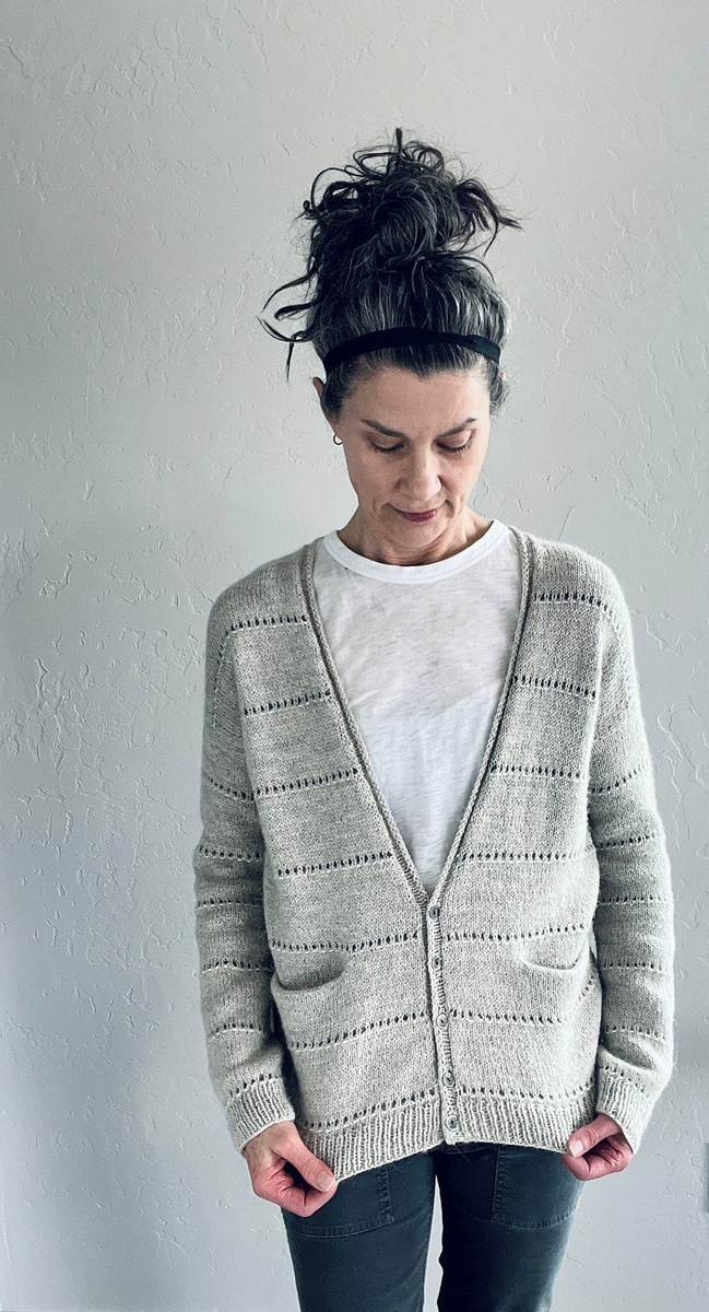 Он имеет свободный крой и выполнен в светлых тонах. Кардиган украшен рельефным узором, который придает ему объем и текстуру.