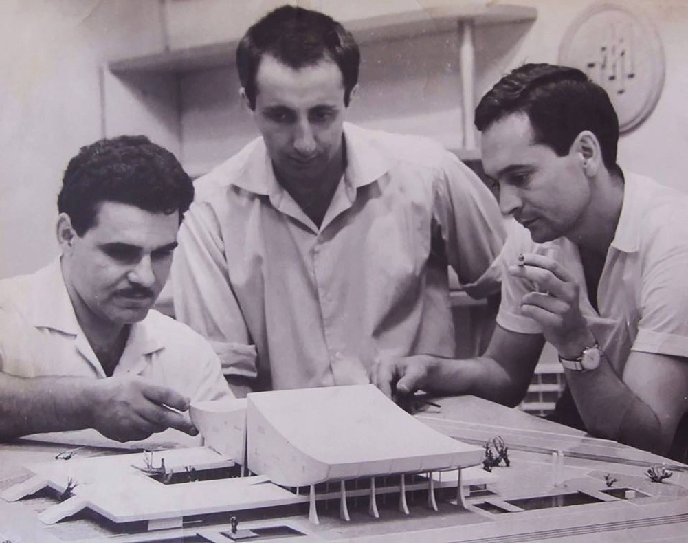 В предыдущих материалах искусствовед, историк и теоретик архитектуры, гид проекта «Ереван глазами инженера» Дмитрий Котов уже рассказывал о не самых известных архитектурных памятниках Еревана. Продолжаем рубрику монументальным примером смелого брутализма с символическими национальными вкраплениями. На фото: С. Хачикян, А. Тарханян и Г. Погосян с макетом кинотеатра «Россия». 1970–1971.