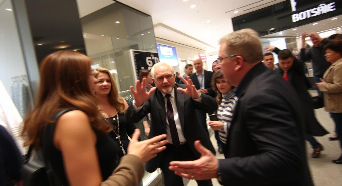 Вернулся назад к началу: это произошло в одном из центральных торговых районов Москвы в прошлые выходные, в обеденное время, когда поток покупателей был плотный. В бутике работала молодая продавщица, к яркой витрине подошёл мужчина, приехавший в столицу на выходные — по словам очевидцев, шумный, в приподнятом настроении, много выпивший. Он начал мешать покупателям, стукнул витрину, сорвал с полки товар и поднял голос на девушку, которая попросила его успокоиться. Увидев сцену, рядом находившийся знаменитый комик — он пришёл в магазин без охраны, узнаваем по внешности — вмешался. Так началась та самая цепочка событий, которая теперь обсуждается на всех каналах.