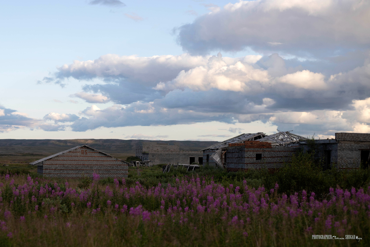 Посёлок Скорбеевка (иногда пишут Скарбеевка) - оставленный военный городок с видом на одноимённую бухту и атмосферой замершего времени. Пишут, что люди отсюда ушли в 1996 году. Мы проехали его с короткой остановкой, за которую я успела сфотографировать несколько зданий, остатки ПАЗика в гараже без дверей и несколько зданий с земляной крышей, явно замаскированные от авиации. Губа Скорбеевская - одно из самых мощных впечатлений поездки. Во-первых, ещё из посёлка, который стоит на возвышении, было видно, что рельеф этой местности сотворил устойчивый северный ветер, непрерывно дующий с Северного Ледовитого океана примерно вечность. Если вы нальёте в блюдечко, например, молоко, и подуете на него с одного края, то жидкость вздыбится и будет полукругом расходиться в стороны. Тут тоже самое, только вместо молока - суша. Эти исполинские полукольца, уходящие далеко от линии прибоя, хорошо видно даже под тундровым ковром. Вдоль кромки воды - узкая полоса пляжа, о которую бьётся пронзительная бирю