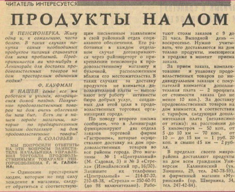 В СССР только калоши были, да? В 1970-х годах в Ленинграде была организована доставка продуктов на дом. Эту услугу предоставляли два магазина. Для заказа нужно было просто позвонить и выбрать товары из их ассортимента. За доставку взималась дополнительная плата в размере 2% от стоимости заказа, но не меньше 10 копеек. Цена за доставку зависела от расстояния: до 5 км – 50 копеек, от 5 до 10 км – 70 копеек, от 10 до 15 км – 1 рубль 20 копеек, свыше 15 км – 2 рубля.