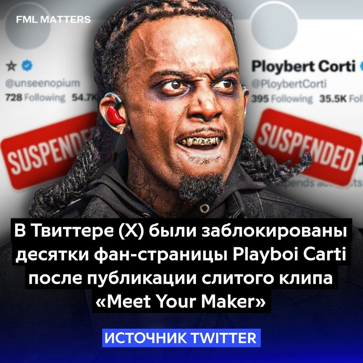 Вчера в Твиттере (Х) были заблокированы крупные фан-страницы Playboi Carti после публикации слитого клипа «Meet Your Maker». Общая потеря аудитории составила более 120+ тысяч подписчиков