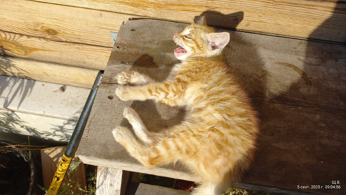 Ну и про что вам рассказать? Про картошку? Про рыбалку? Про отел коровий или про переезд свиньи? Всем моим самым замечательным по самому наидобрейшему!!! На самом деле время уже 10 вечера. Я сегодня весь день отлеживалась. После вчерашних трудовых будней. А расскажу ка я вам про кота. Василия. Вот. Глядите. Лежит. Орет. Хочет жратеньки.А хозяйка спит. От куда взяли? А вота. Это мы, 24 августа, поехали по магазинам. В машину сели, отъехали, а под ней два рыжика было. Как не подавили... Надеялись, что там где то мамка. Кормит их, поит... На следующий день одно дите куда то делось. А второе лежало и верещало. Пришлось притащить к крыльцу и кормить. Так и живет теперь. Потом поедет а Нюшику в коровник.. Не домой же его тащить.. На некрашенный пол... На этом все, роднульки мои. Спать пойду. Спокойной ночи всем. И до завтра.
