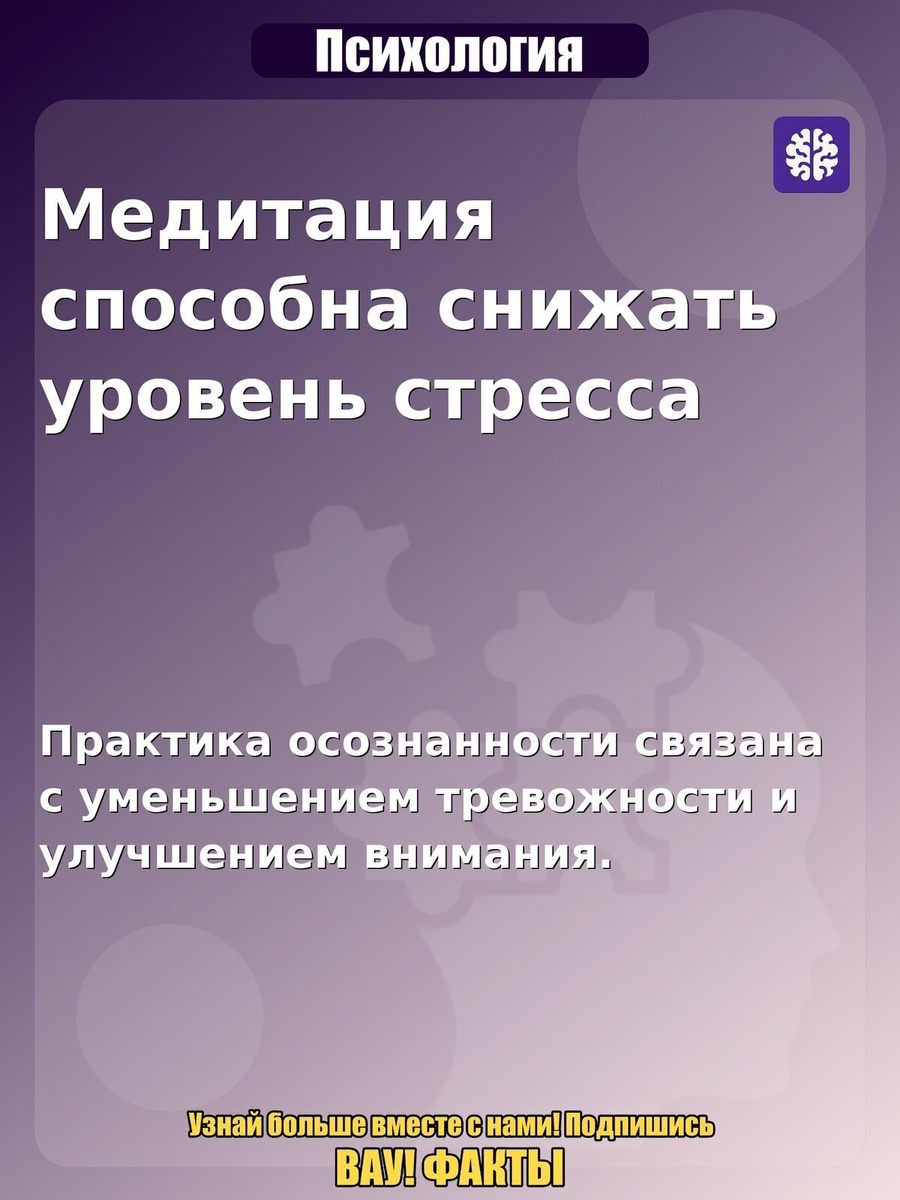 Медитация способна снижать уровень стресса. Практика осознанности связана с уменьшением тревожности и улучшением внимания. Интересный факт по теме «Психология»: Медитация способна снижать уровень стресса. Почему так: Практика осознанности связана с уменьшением тревожности и улучшением внимания.. Поделитесь в комментариях, знали ли вы об этом и стоит ли делать продолжение по теме. #психология #факты #мышление