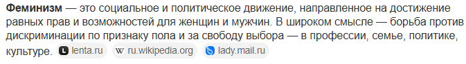 Но! Что могу точно сказать: если посмотреть на краткое описание каждого движения, мне близка идея либерального феминизма. Чтобы у женщин были все возможности, которые есть у мужчин, и нас не пытались силой или моральным давлением заставить соответствовать чьим-то представлениям о "правильной женщине". Такое видение мира у меня было всегда, сколько себя помню, и для меня это про адекватные отношения в обществе, отношения между мужчиной и женщиной, без насилия и навязанных ограничений прав. Про нормальный, цивилизованный, человеческий мир, где есть уважение друг к другу.