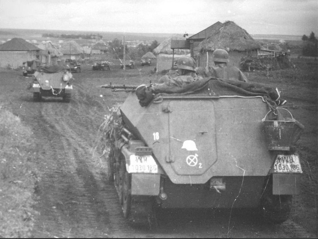Бронетехника 2-го разведывательного батальона дивизии «Великая Германия» на марше в селе Девица Семилукского района. На переднем плане бронетранспортер Sd. Kfz. 250. Фото сделано июль 1942 года. Фото 1. Дача Башкирцева, город Семилуки, Семилукский район, Воронежская область. В этом здании, построенном известным промышленником Иваном Сергеевичем Башкирцевым, был частым гостем поэт Алексей Васильевич Кольцов, с 1832 года - 1841 года. Также здесь был госпиталь с 1941 - 1942 года. В ходе боёв здание серьёзно пострадало. Фото примерно весна 1943 года. Фото 2 Село Нижняя Ведуга, Семилукский район, Воронежская область. Видимо начинается отступление, хотя возможно происходит пока перемещение обозов. Январь 1943 года. Фото 3. Разбитая средняя школа в городе Семилуки, Семилукского района, Воронежской области. Январь - февраль 1943 года. Фото 4 Семилукский железнодорожный мост разрушен. В ночь на 5. 7. 42 г., чтобы воспрепятствовать переходу немцев через мост, была послана группа сапёр, во гла