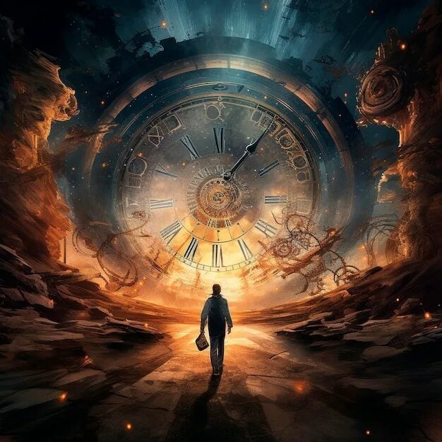 Мы вошли внутрь, где меня ждал мой коллега по отделению временных перемещений. Рядом стояла машина времени, похожая на гигантские часы, окружённые мерцающими лампочками и циферблатами.