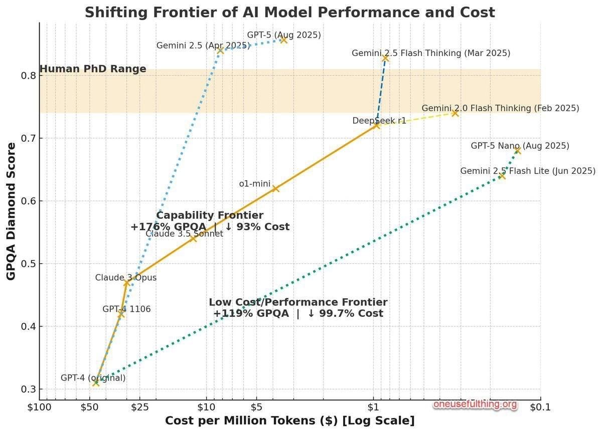 Наткнулся на интересный график - видно, что ИИ до сих пор выжимают максимум из своих архитектур и при этом еще вполне есть куда расти. С момента выхода GPT-4 прошло больше двух лет, и за это время качество ответов моделей выросло в полтора раза, а стоимость их работы обвалилась почти на 93% (токены). Просто наращивать количество параметров уже не спасает, но сейчас появились MoE, разные умные роутинги, reasoning и прочие хитрые фишки, которые открыли новый простор для развития. В итоге ИИ будет становиться умнее и дешевле, а значит - начнет пробираться во все больше сфер и задач. Русский ИТ бизнес
