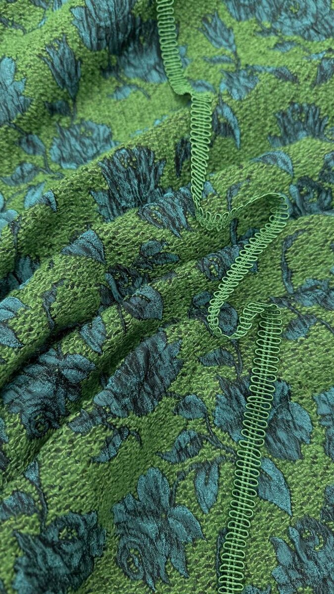 Игру фактур поддерживает интересное сочетание теплого и холодного оттенков зеленого. Полотно мягкое, пластичное, слегка растяжимое.