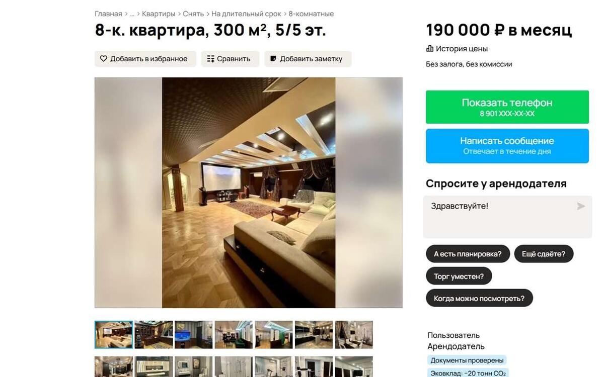 В Воронеже найдено самое дорогое объявление по аренде квартиры в центре города. Собственник разместил лот на сайте Авито. По условиям аренды жилье позиционируется как премиум‑объект с полным комплексом сервисов и высокой предоплатой. Это самое дорогое предложение на сайте бесплатных объявлений среди квартир, которые сдают в аренду. В цену включены все коммунальные платежи, интернет, обслуживание 600‑литрового аквариума и уборка 300 кв. м. три раза в месяц. По словам автора объявления, в 8-комнатной квартире в доме №62 по улице Коммунаров есть собственный спортзал, два санузла, гардеробная, спальня с кроватью king‑size и «звездным небом» с кристаллами Swarovski, кинозал с баром и аудиосистемой, а также система фильтрации воздуха. Такая роскошь обойдется в 190 тысяч в месяц. Однако заявленная цена актуальна при оплате авансом за полгода. При аренде от 3 месяцев до года – 230 тысяч рублей в месяц, при аренде до 1 месяца – 350 тысяч рублей.