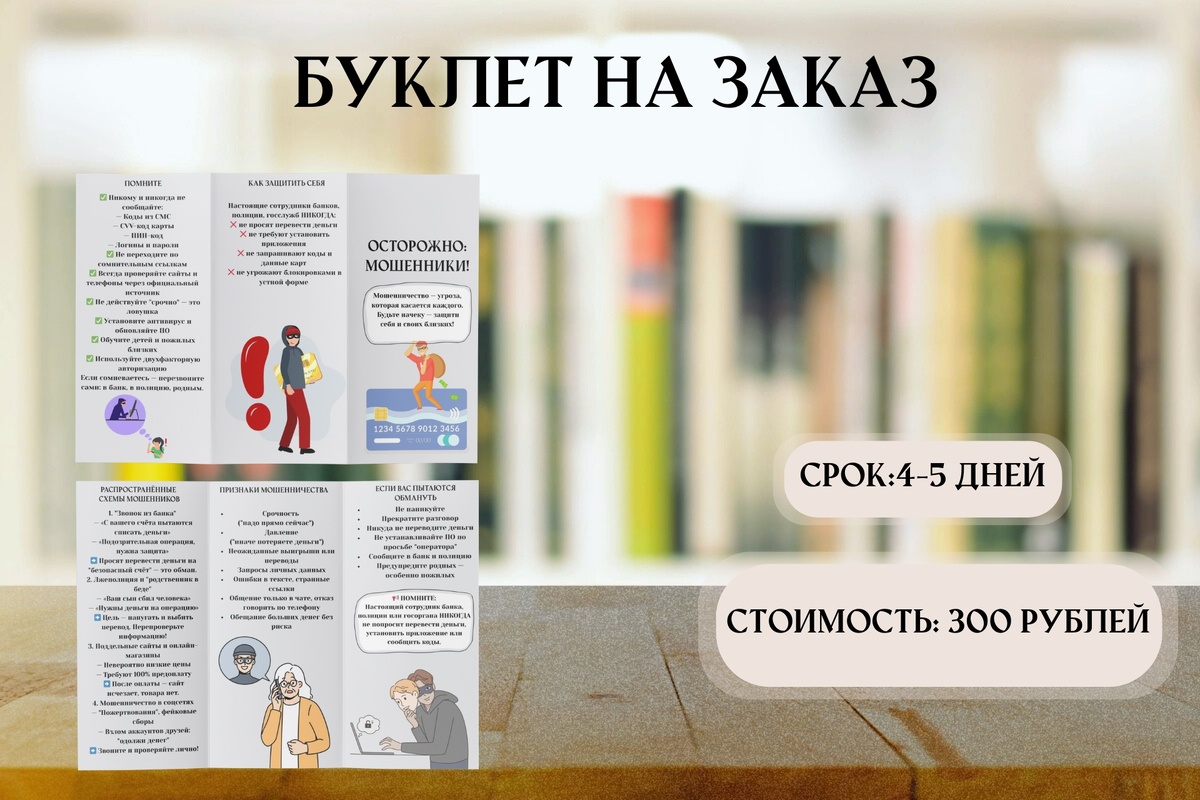 Представьте: в вашей библиотеке проходит выставка новых поступлений или готовится крупное мероприятие для читателей. Как привлечь внимание? Как рассказать о событии так, чтобы мимо не прошел ни один посетитель? Обычные объявления на дверях часто остаются незамеченными. Что, если бы у вас был яркий, информативный и профессионально сделанный буклет? Тот, который не стыдно вручить любому гостю. Тот, который работает на имидж библиотеки 24/7. Теперь это возможно! 🎉 Мы запустили услугу по созданию индивидуальных буклетов специально для библиотек. Это не шаблон, а уникальный продукт, разработанный с нуля именно для вас. Мы понимаем, что у сотрудников библиотек нет лишнего времени на освоение дизайнерских программ. Поэтому мы делаем всё под ключ: 📝 Текстовое наполнение: