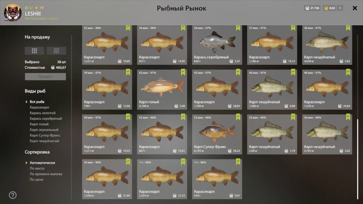 - Рыба: Карасекарп, Карп голый, Карп чешуйчатый, Супер Фрикс, Карась серебряный