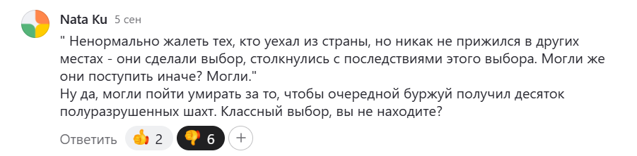 Написал я недавно статью про целенаправленную инфантилизацию населения (казалось бы - крамола сплошная, то есть диванные либералы должны были бы меня поддержать), которую запустили на рубеже веков в нашей стране и плоды которой мы с вами пожинаем сегодня. Основным толчком к её написанию стала история 25-летней дурочки, которая, будучи в браке и имея ребёнка, залетела от любовника - и оправдывается тем, что "так вышло". Но для дополнительного эффекта упомянул я в статье и других инфантильных ребят: тех самых, которые сломя голову понеслись от мобилизации (которой из них практически ни один не подлежал) заграницу, не смогли там найти работу и скулят, что они "вынуждены были" всё бросить, а теперь не знают, что делать. Кто считает, что это позиция не капризного ребёнка, а взрослого сознательного человека, пусть первым бросит в меня камень. На всякий случай, давайте уточним: речь вообще не шла об осуждении всех, кто по каким-то причинам покинул Россию, и позицию относительно происходящих