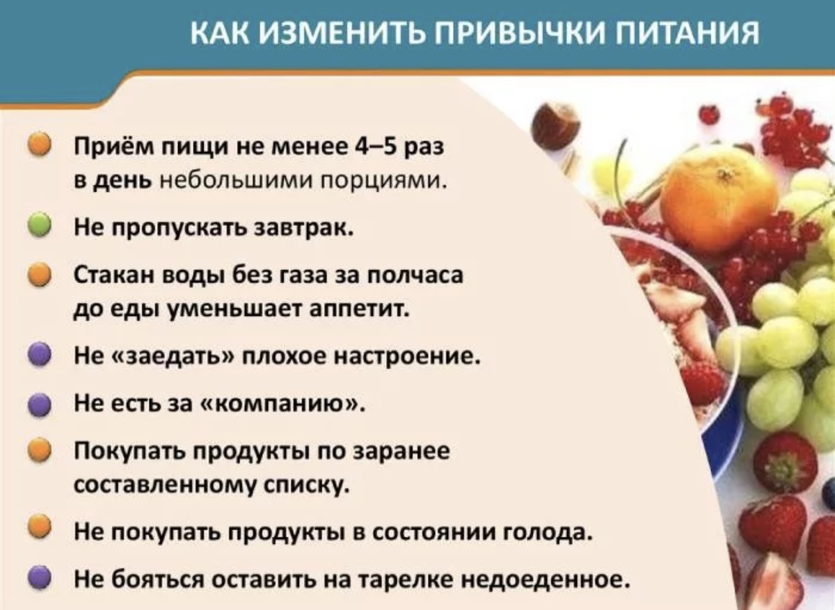 - Регулярное питание: 3–4 основных приёма пищи в день
