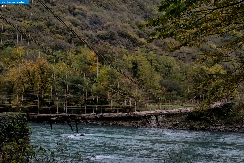 Подвесной мост расположен в Сочи над рекой Псезуапсе. Пройти его - еще то испытание. Жуткая амплитуда колебания, ветхие и редкие доски настила, если его можно так назвать, а внизу бурная река бьет и грызет огромные камни.