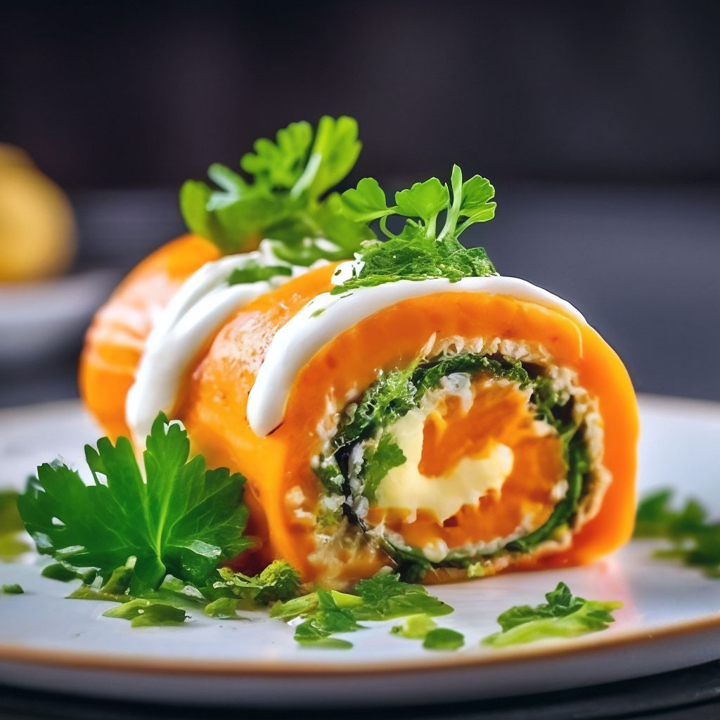 👩🍳 Приготовление: 👩🍳⭐ Шаг 1. Обжаренная морковь придаёт блюду насыщенный вкус. Натрите морковь на крупной тёрке и слегка обжарьте её на растительном масле, пока не станет мягкой и приятной на вид. Оставьте остывать. ⭐ Шаг 2. Разделите яйца на белки и желтки. Белки отдельно взбейте до пышных крепких пиков, желтки соедините с остуженной морковью, мелко нарезанной зеленью лука и укропа, посолите и поперчите. ⭐ Шаг 3. Подготовьте форму для запекания, застелив её пергаментом и слегка промазав маслом. Распределите равномерным слоем нашу морковную смесь и отправляйте в заранее прогретую духовку примерно на 15 минут при 180°C. ⭐ Шаг 4. Пока основа готовится, займитесь начинкой. Натирайте оба вида сыров на крупной тёрке, приправьте их небольшим