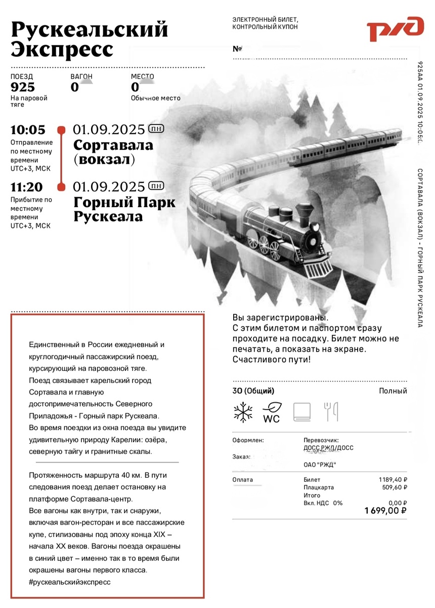 Это мой счастливый билетик на поезд: Чего я ожидала от Рускеальского экспресса? Атмосферы. Красоты. Необычных впечатлений и новых видов. И начались они уже со станции Сортавала (вокзал). На подходе к станции нас встретил такой нарядный паровоз: Он и создаёт то самое радостное предвкушение "сейчас что-то будет". Рускеальский экспресс уже ожидал путешественников. Элегантные девушки-проводники стояли у синих вагонов: Уже одно то, что этот поезд выглядит как ни один другой, пробуждает необычное настроение - как будто бы мы в другой реальности. Кому хочется отвлечься от рабочих будней и повседневности, тому нужно на Рускеальский экспресс - перезагрузка и обновление гарантированы) В Рускеалу мы ехали на поезде 925 - Ретропоезд, а обратно на поезде 922 - Рускеальский экспресс. Вот выдержка с одного сайта: Рускеальский экспресс (921/ 922/ 923/924): общие с выбором места вагоны, фото-купе, вагон первого класса № 1, вагон-ресторан царский № 3, старорусский вагон-ресторан № 30. Ретропоезд (925/9