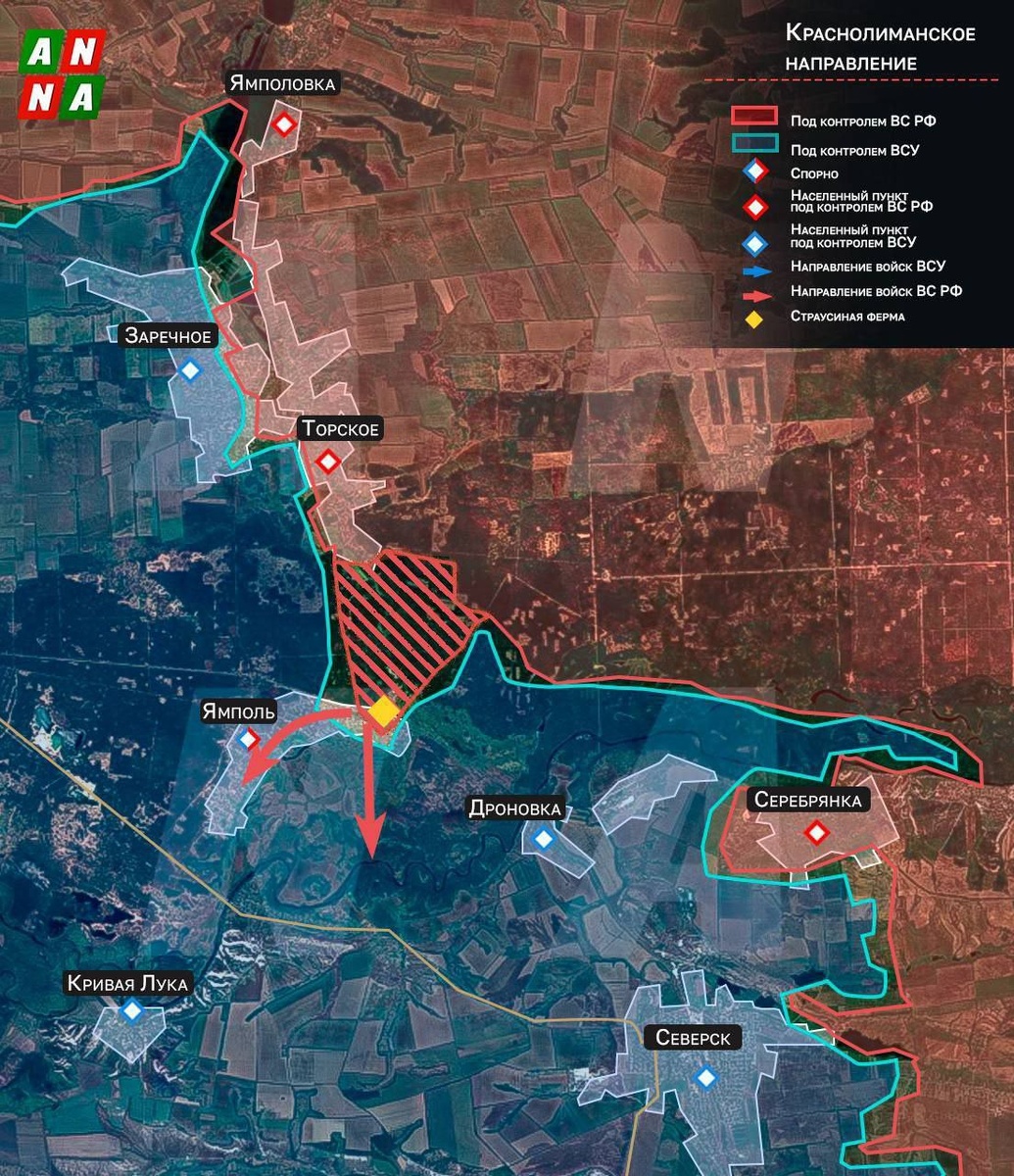 Освобождение страусов. Российские войска наступают в Серебрянском лесу. Им удалось выбить ВСУ с территории бывшей страусиной фермы (закрыта с 2022 года после отступления армии России из района), занять самую плотную часть леса и выйти на подступы к населенному пункту Ямполь. На нём держится не только логистика противника в оставшейся части Серебрянского леса, но и логистика ВСУ в Северске. Так, через Ямполь проходит одна из дорог, ведущих напрямую к городу. Когда ВС РФ освободят его, то могут вызвать серьезный кризис у ВСУ на этом направлении. Lesen Sie weiter unten auf Deutsch...