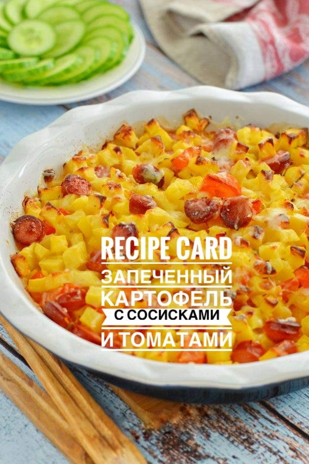Очень простой,но в то же время очень вкусный рецепт замеченной картошки с сосисками и сыром! Ингредиенты: Картофель - 450 гр. Сосиски - 200 гр. Помидоры - 270 гр. Майонез - 100 гр. Сыр - 90 гр. Чеснок - 1 зубчик. Паприка молотая - 0.5 ч.л. Соль - по вкусу. Перец черный - по вкусу. Процесс Приготовления: Шаг 1. Включаем духовку на 190 градусов и нарезаем картофель кубиком среднего размера. Шаг 2. Нарезаем сосиски кружочками,не сильно тонкими и нарезаем томаты некрупным кубиком. Шаг 3. В миске соединяем все нарезаные ингредиенты, добавляем майонез, соль, черный молотый перец, и паприку, аккуратно всё перемешиваем. Шаг 4. Смазываем противень маслом и перекладываем картошку с сосисками и томатом на противень. Шаг 5. Помещаем противень в предварительно разогретую духовку до 190 градусов на 40 минут. Шаг 6. После 40 минут натираем сыр и посыпаем картофель. Картофель готов!Приятного Аппетита!