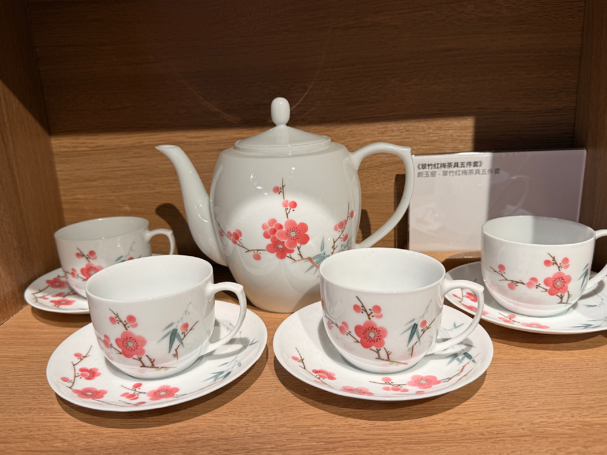 В одном из залов выставлен нежный, традиционный фарфор с простеньким рисунком: цветущие ветки. Оказывается, именно такой сервиз был у Мао Цзедуна и уже много лет эти сервизы воспроизводятся снова и снова, и пользуются большой популярностью. Видимо для усиления эффекта к этой посуде выпускают и фигуру самого отца народов, причем в разных масштабах. И удивительно, что это продолжают покупать!