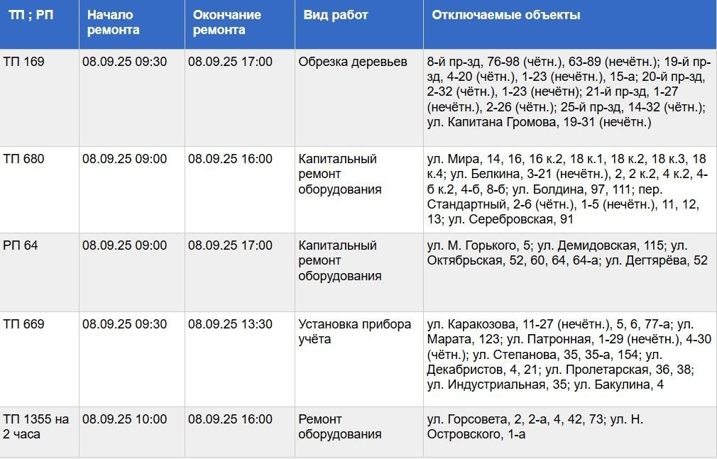 ⚡️ 8 сентября в Туле отключат электричество на нескольких улицах