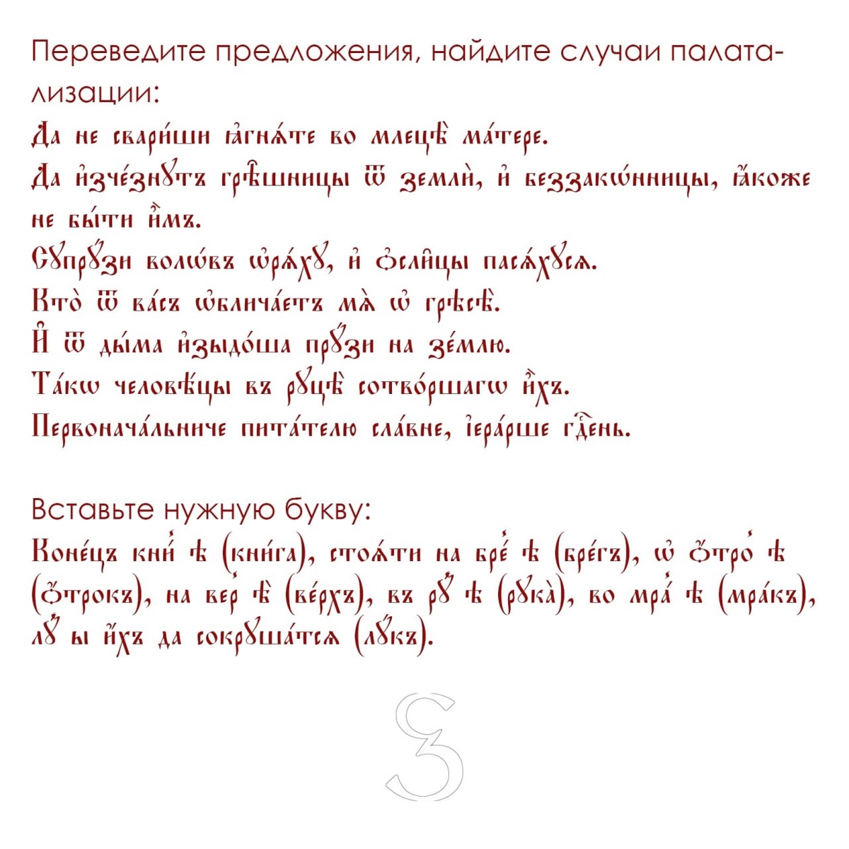 Сегодня предлагаем разобрать два упражнения из нашего учебника церковнославянского языка. Оба они на палатализацию, кто справится? А если Вы хотите начать без труда читать древнерусские рукописи, присоединяйтесь к нашему годичному курсу, сейчас самое время, ведь действует цена ранней регистрации, а для Вашего удобства оплата разделена на две части, вторая будет только в конце октября! Программа курса и регистрация zelomi.ru/education