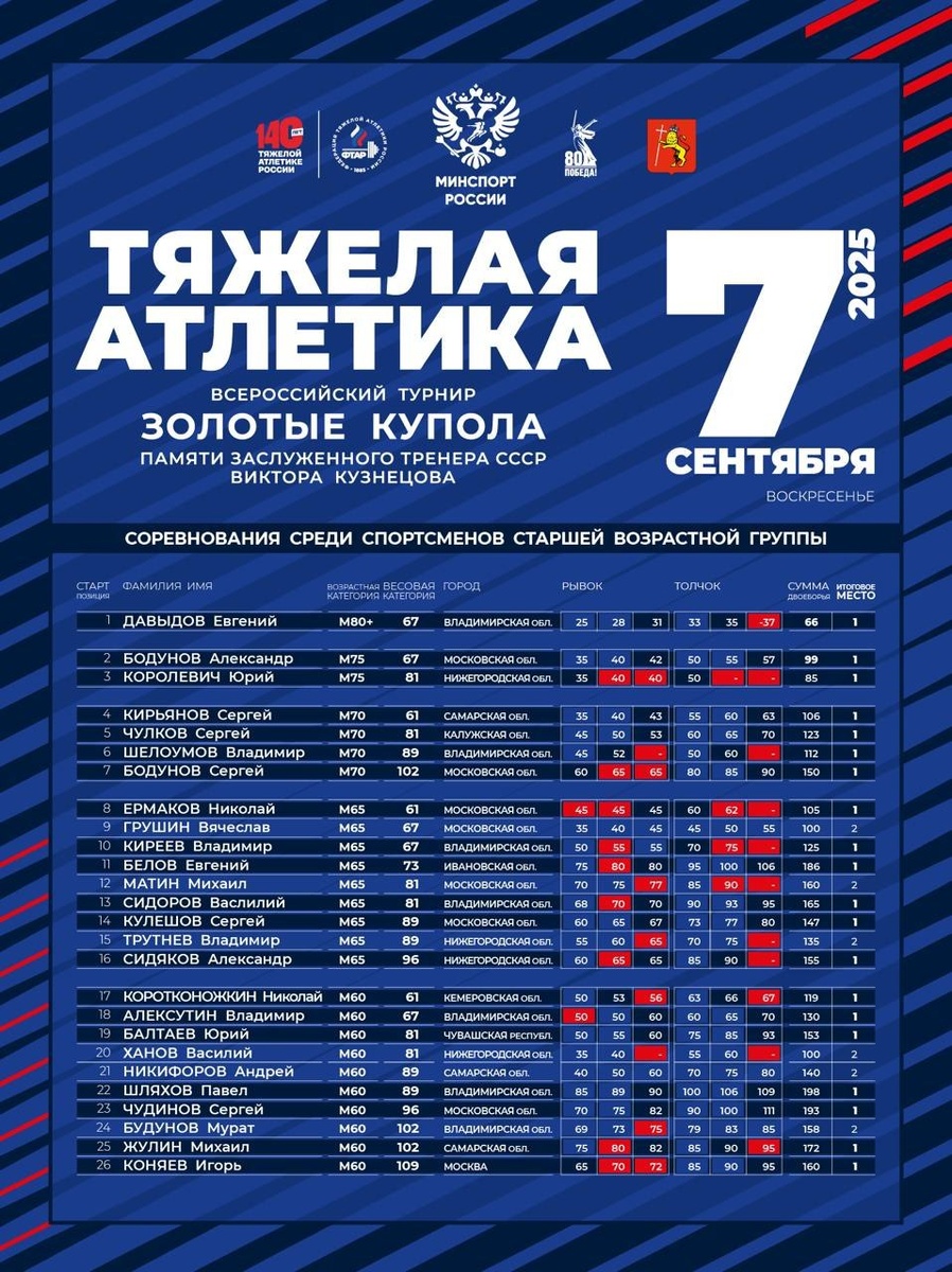 Самым старшим спортсменом, поднявшимся в этот день на помост среди мужчин, стал Евгений Давыдов, представлявший Владимирскую область - в этом году ему 80 лет. Среди женщин старейшей участницей была Наталья Зубехина - ей 74 года. Она является рекордсменкой, чемпионкой России среди старших возрастных групп, а также мастером спорта международного класса по легкой атлетике.