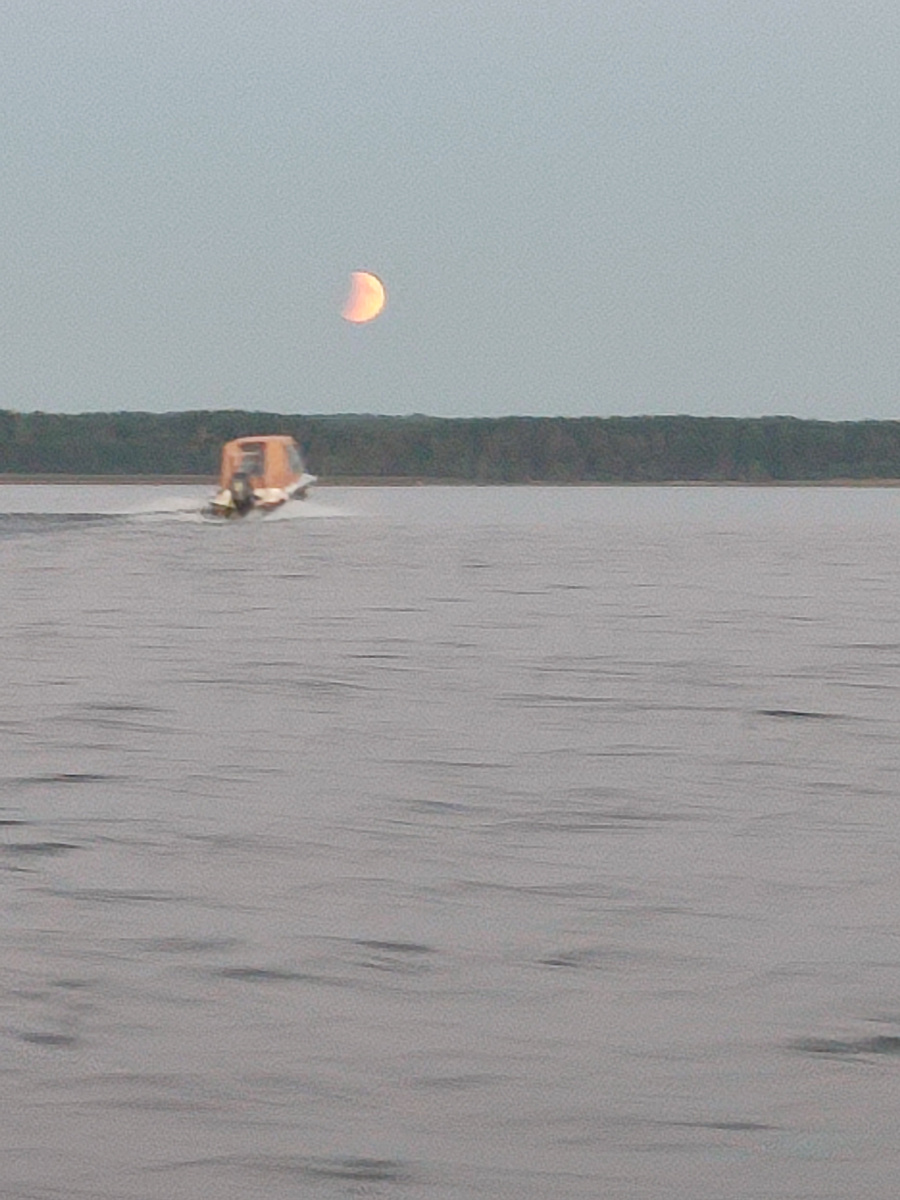 Сегодня мне повезло Вечером во время рыбалки началось лунное затмение как только Солнце зашло через несколько минут начала сходить Луна на Востоке который уже было частично перекрыто тенью Земли я успел сделать несколько фотографий сначала на телефон а потом когда вернулся на берег с помощью телескопа.