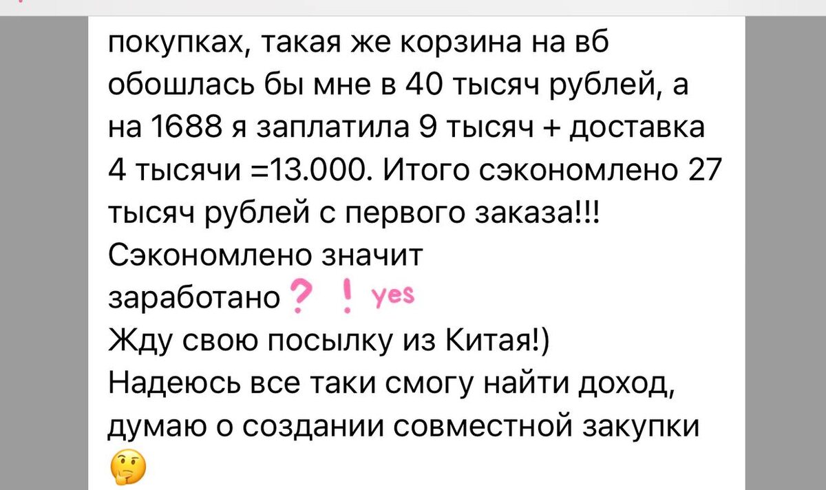 Вырываю из большого сообщения от Полины кусочек, что бы показать Вам экономию с одного заказа в Китае. ➡️Корзина на 🛍 40.000₽ ✔️Заказ этих же позиций 13.000₽ ( это с доставкой ) 😱 Экономия 27.000₽ - неплохо да. Почти в 4 раза окупился проект. А сэкономил = заработал ❤️🔥