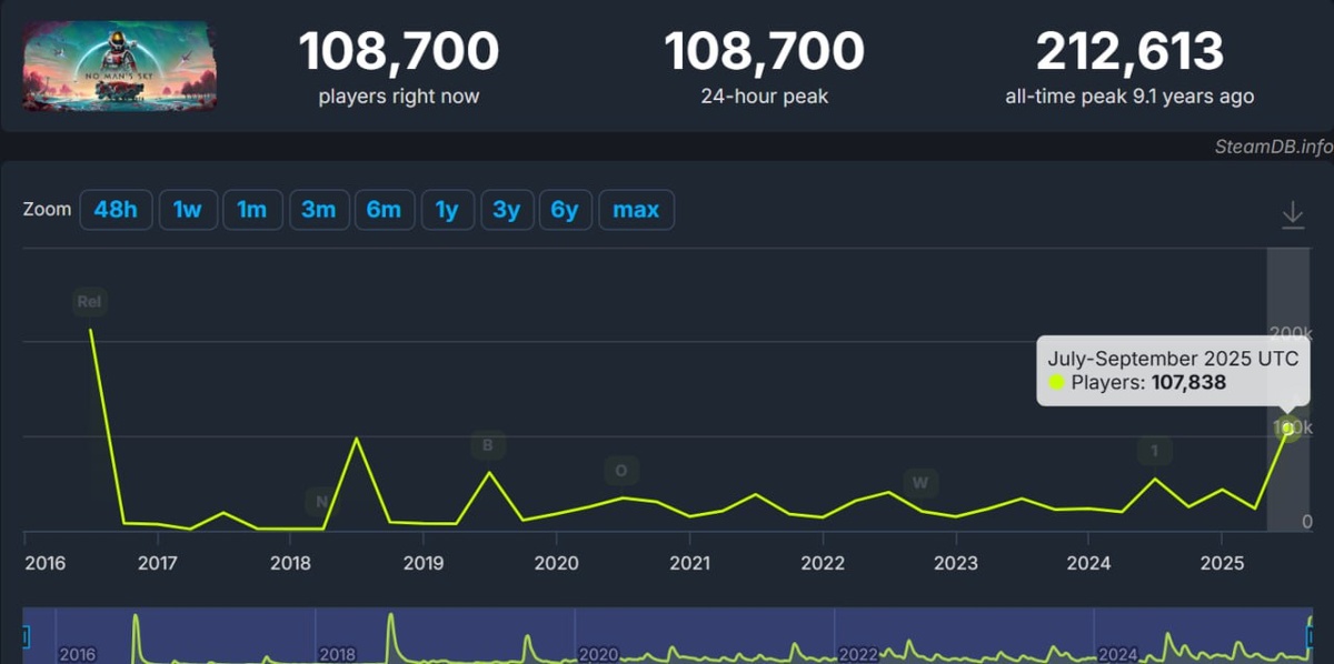 Пиковый онлайн No Man's Sky набрал больше 100 тысяч игроков впервые за 9 лет рннее 212 тысяч было только на релизе, после провала которого