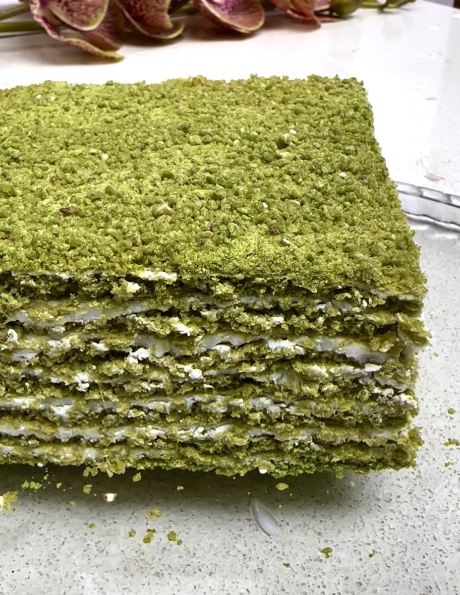 Нежно-зелёные, красивые коржи с добавлением свежего шпината. Шпинатный вкус не чувствуется в готовой выпечке. Ингредиенты: 120 гр овсяной муки; 50 гр безглютеновой муки; 4 яйца; разрыхлитель; мед 2 ст.л.; растительное масло 3 ст.л.; сахарозаменитель; 70 гр-шпинат Крем: мягкий творожок -550 гр.; греческий йогурт-150 гр.; жидкий мед 1 ст.л.; сахарозаменитель по вкусу Яичные белки отделяем от желтков. Взбиваем белки с сахарозаменителем до крепких пиков. В кастрюльке топим мед, добавляем растительное масло. Убираем с огня. Смешиваем муку и разрыхлитель. В блендере пробиваем шпинат до однородного состояния добавляем желтки, медовую смесь. Добавляем сухие ингредиенты и еще раз хорошо пробиваем в блендере. Добавляем белки, аккуратно силиконовой лопаткой размешиваем. Тесто делим на 2 части. Выливаем на силиконовый коврик, разравниваем. Выпекаем при температуре 170 градусов до легкого зарумянивания. Крем: смешиваем все ингредиенты перемешиваем до однородной массы. Готовый корж нар