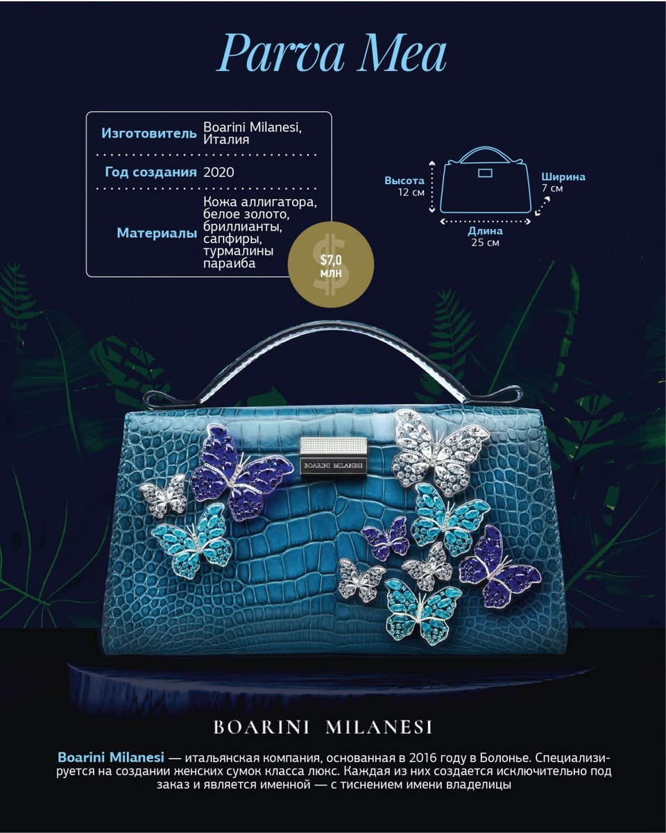 Итальянский бренд Boarini Milanesi представил женскую сумку «Parva Mea», которая претендовала на статус самой дорогой сумки в мире. Ее стоимость составляет семь миллионов долларов! «Boarini Milanesi Sette Del Cuore» в переводе как «Сердце мира», была создана в 2020 году Сообщается, что на создание такой яркой модели аквамаринового цвета сооснователя бренда Маттео Миланези вдохновили морские прогулки с его семьей. Parva Mea — это дань уважения его погибшему отцу, с которым он отправлялся в путешествия вдоль берегов Сардинии и Греции. Там предприниматель часто находил бутылки, прочий мусор и нефтепродукты. Именно поэтому около 13% от продажи этих сумок отправляется организациям, занимающимся очисткой морей от пластика. Parva Mea, что в переводе с латинского означает «Моя малышка», выполнена из кожи аллигатора, окрашена в бирюзовый цвет и украшена десятью бабочками из белого золота и драгоценных камней. Так, бриллианты символизируют капли дождя, сапфиры – океан, а турмалины параиба (са