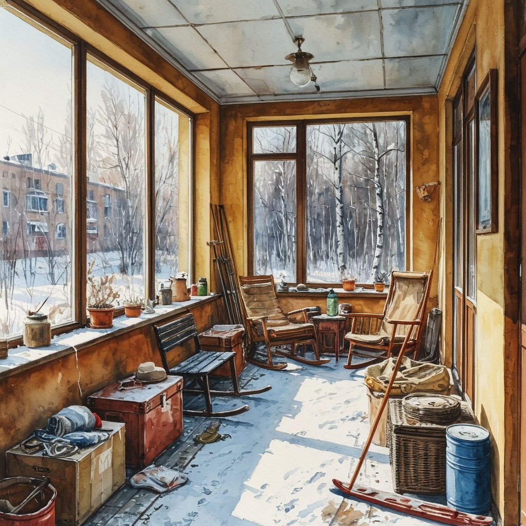 Наш балкон был архивом забытых времён. Это была самая загадочная, пограничная территория нашей квартиры, некое отдельное государство между уютным миром дома и большим внешним миром. Царство забытых вещей, запылённый ковчег, молчаливо плывущий в неизвестность за стеклянной стеной, которая постоянно запотевала от разницы температур, превращаясь в матовое полотно. Он всегда пах по-особенному: сладковатой древесной пылью от старого шкафа, холодком от стекла и едва уловимым, горьковатым запахом уходящего лета, которое словно выдохнуло в щели перед тем, как уснуть до следующего года.