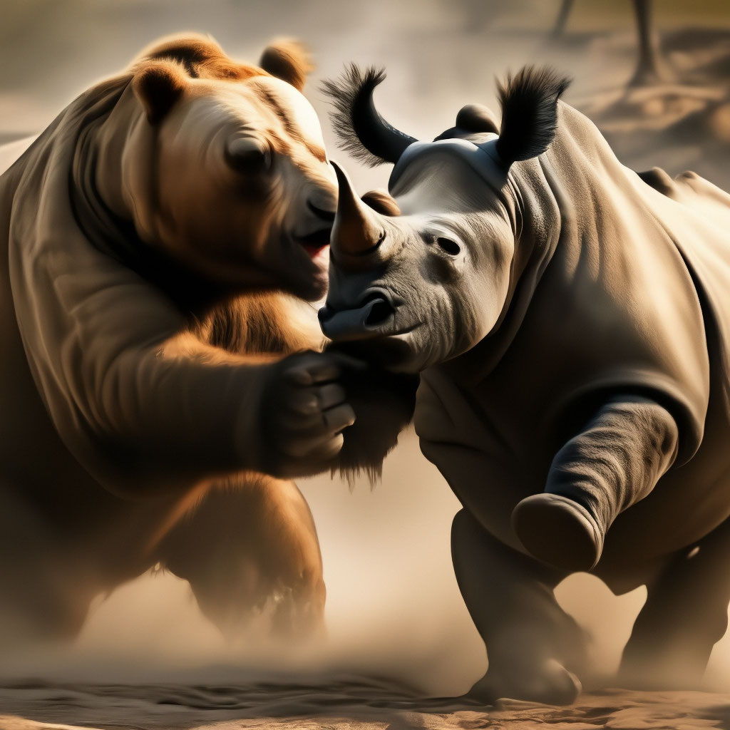 Несмотря на всю свою силу и ловкость, медведь находится в невыгодном положении перед носорогом. Рог носорога может мгновенно проткнуть медведя, а броня защищает его от большинства повреждений.Кроме того, у носорога достаточно массы и силы, чтобы в