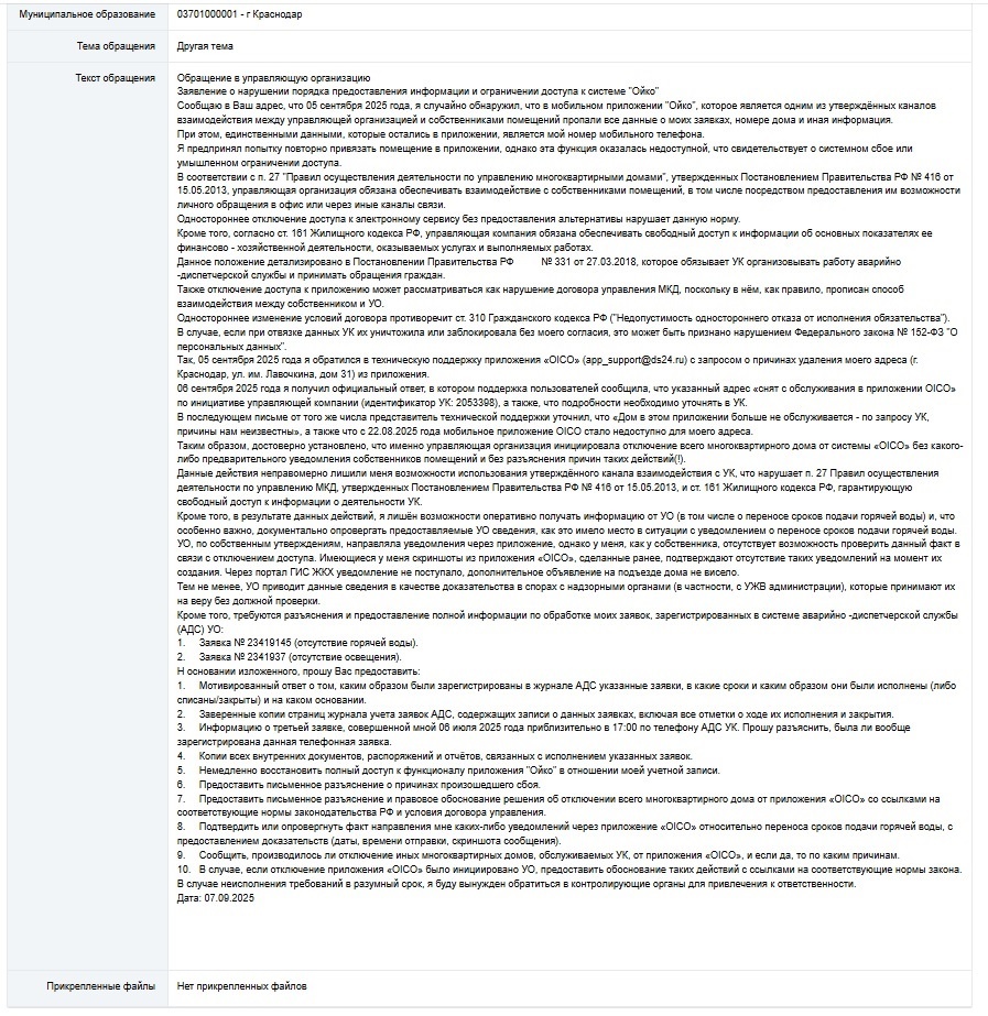 2.5. Удаление аккаунта было совершено без моего согласия и без уведомления, что лишило меня возможности проверить факт уведомления УО о переносе сроков подачи горячей воды.