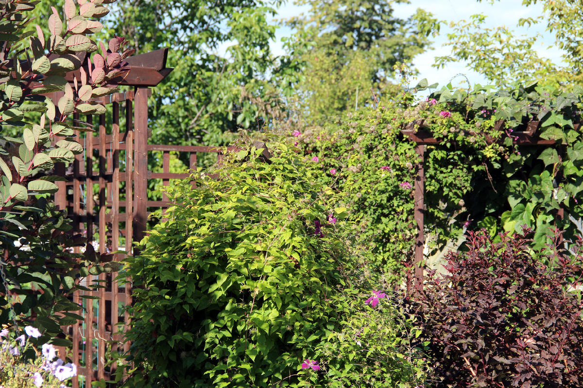 В августе наш сад выглядит очень спокойно. В это время мало что цветет, но он остается цветным и сочным. Фаворитами августа становятся декоративные кустарники с цветной листвой. Пару лет назад мне писали, что в саду безобразно много клетки. Слишком много шпалер и пергол. Сейчас клетку почти не видно. Зато сад объемный и не просматривается сразу весь. А еще писали, что мой сад будет похож на промышленный виноградник. Разве так выглядят виноградники? Недавно пугали меня экзотическими джунглями, в которые мой сад скоро превратится. А я так долго этого ждала. Пару лет назад прочитала статью, где использовалось понятие "сад-нора". Это мой вариант идеального сада. Мне нужен сад, в котором я буду чувствовать себя защищенной и ощущать изолированность от внешнего мира, спокойствие, умиротворение. В августе сад становится багрово-розовым. Цветут очитки с бордовым листом. Метельчатые гортензии. Лапчатка. В правильном саду с весны до поздней осени что-то должно цвести или выглядеть декоративно. М