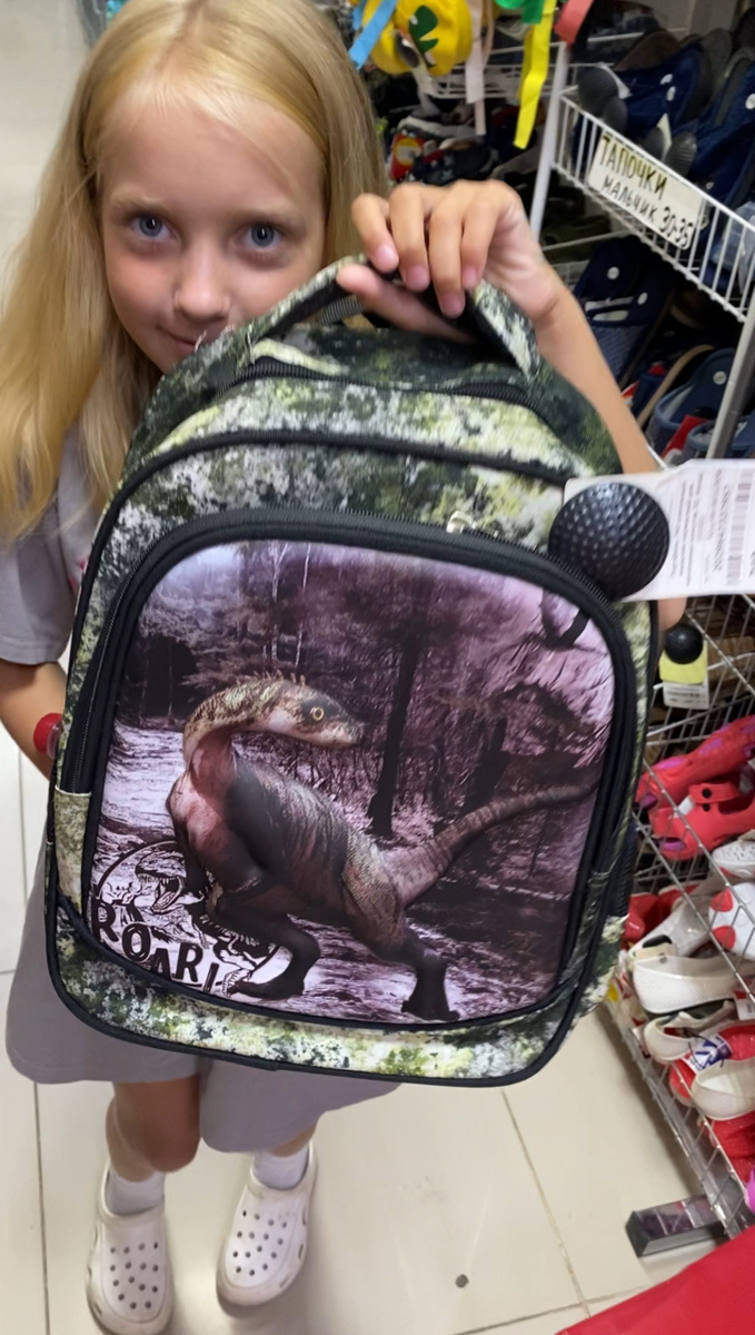 Есть такие цены?! Да. Есть красивые рюкзаки за такую цену с твёрдой спинкой - да. И я увидела такой симпатичный рюкзак уже в другом магазине, но София сказала : ‘Нет’. Видите ли у котика розовые щёчки .. Симпатичный рюкзак в бело-чёрном цвете, как она и хотела, наружный карман в виде мордочки котика и маааленькие точки розовые щёчки , ну очень милый рюкзак, но София не согласилась. Выбрала такой рюкзак, что папа был в шоке. В цвете хаки с динозавром!