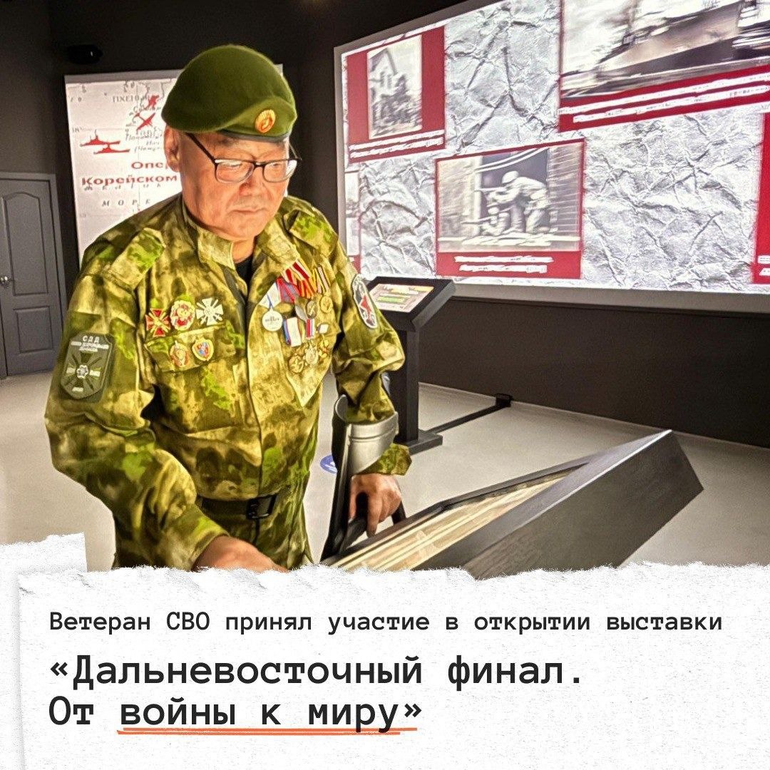 В историческом парке «Россия – моя история» в Якутске состоялось торжественное открытие мультимедийной выставки. Экспозиция создана Южно-Сахалинским историческим парком при поддержке Министерства просвещения РФ, Правительства Сахалинской области и Министерства культуры и архивного дела Сахалинской области в рамках реализации нацпроекта «Образование». Особым гостем мероприятия стал ветеран двух войн – участник боевых действий на Северном Кавказе и специальной военной операции Николай Петров. «Мы, бойцы добровольческого отряда «БАРС-2», продолжаем славные боевые традиции наших отцов и дедов, которые одержали победу над милитаристской Японией. Как и они, мы твёрдо знаем: защищаем свою землю, свои семьи, свою историю. Уверен – враг будет разбит, и Победа будет за нами!», – убежден ветеран. Инновационная мультимедийная выставка «Дальневосточный финал. От войны к миру» с помощью современных технологий погружает посетителей в события августа-сентября 1945 года, ярко и образно рассказыва