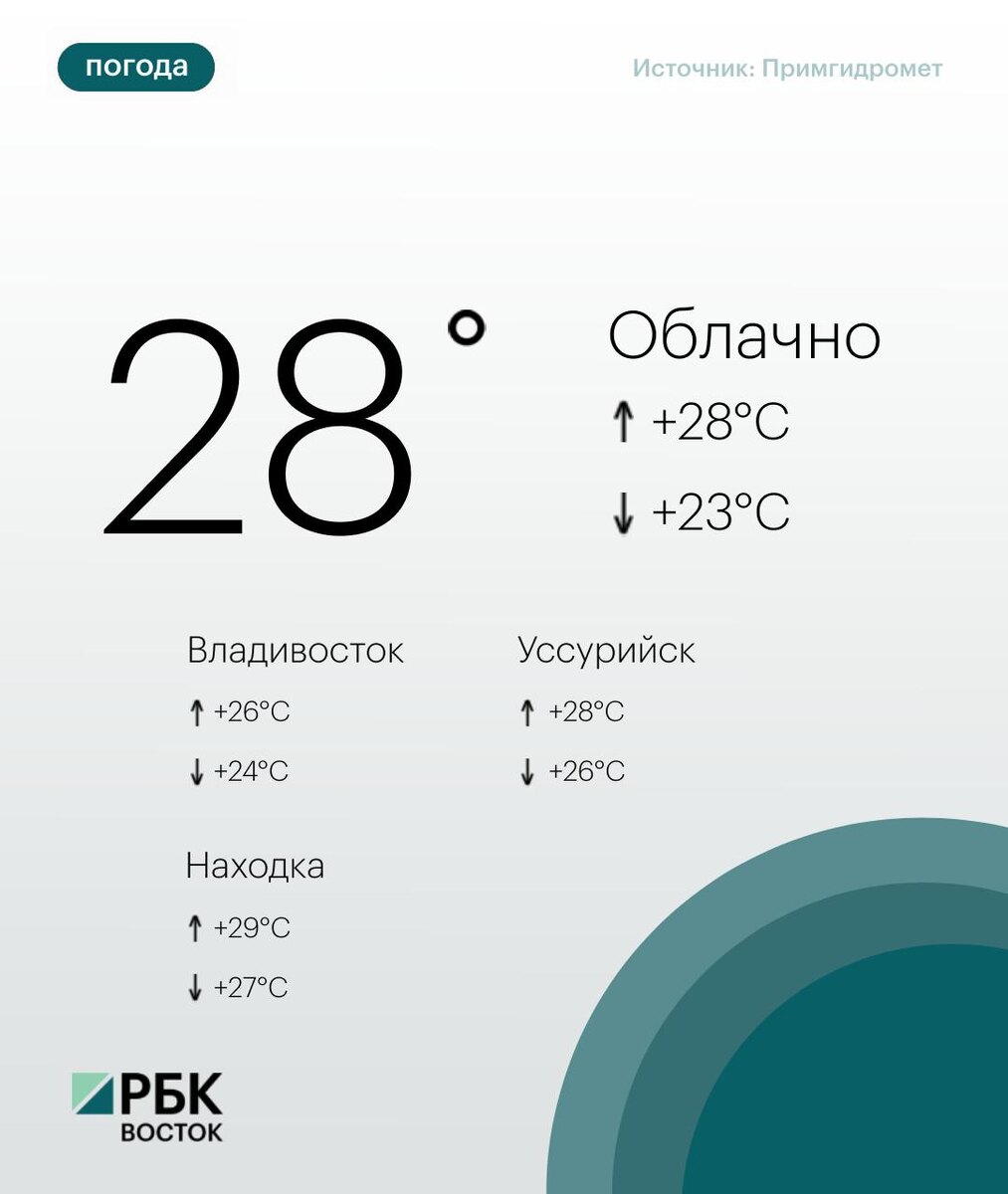 Сегодня погоду в Приморье определяет поле пониженного атмосферного давления. Днем без осадков. Ветер южный, юго-западный умеренный. Температура воздуха +23...+28°C 🌧 Во Владивостоке переменная облачность, без осадков. Ветер южный, юго-западный умеренный. Температура воздуха днём +24...+26°C. 😃Подписывайтесь на РБК Восток