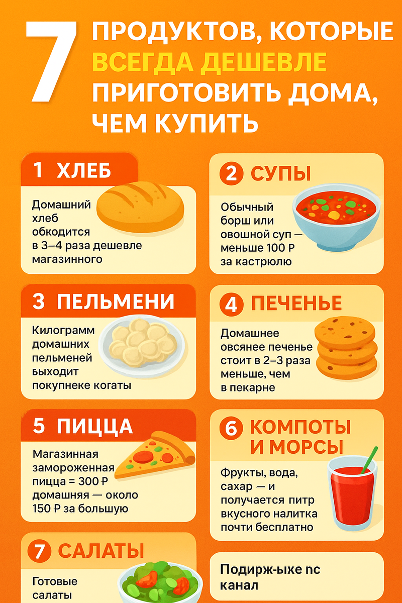 Мы часто тратим деньги на полуфабрикаты и готовые блюда, хотя дома их можно сделать вкуснее и в разы дешевле. Вот список продуктов, на которых реально экономить: Домашний хлеб из муки, воды, соли и дрожжей обходится в 3–4 раза дешевле магазинного. Обычный борщ или овощной суп — меньше 100 ₽ за кастрюлю, которая накормит семью несколько дней. Килограмм домашних пельменей выходит дешевле покупных, а вкус и качество ингредиентов — в ваших руках. Домашнее овсяное печенье стоит в 2–3 раза меньше, чем в пекарне, и можно сделать полезным. Магазинная замороженная пицца ≈ 300 ₽, домашняя — около 150 ₽ за большую. Фрукты, вода, сахар — и получается литр вкусного напитка почти бесплатно. Готовые салаты в супермаркете стоят как ресторанные блюда. Дома те же продукты обойдутся вдвое дешевле. Готовка дома — это не только экономия, но и контроль качества. Иногда достаточно часа, чтобы приготовить еду на несколько дней и оставить в кошельке несколько сотен рублей. 👉 Подписывайтесь на канал — впереди