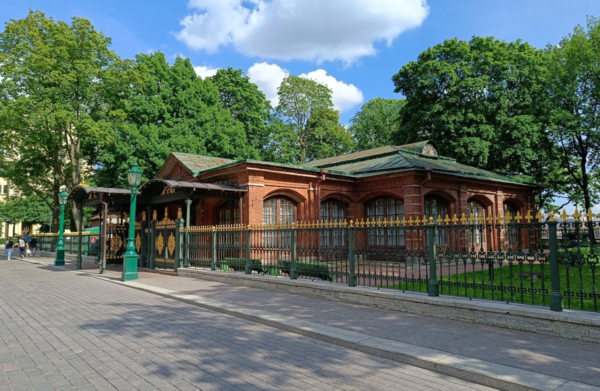 В ходе нашей прогулки у метро «Горьковская» мы остановились у так называемого Домика Петра I. Это одно из старейших зданий в Санкт-Петербурге и, быть может, даже старше заложенной в мае 1703 года Петропавловской крепости. Внешне не очень заметно, потому что постройка скрывается внутри каменного «футляра» XIX века, созданного для лучшей сохранности мемориального деревянного здания.