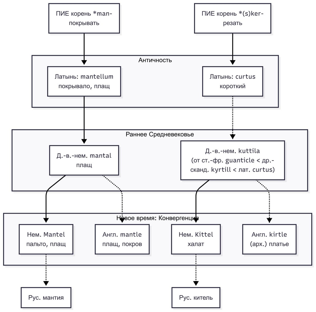 Халатность в этимологии: Kittel оказался не Mantel Когда я приехал учиться в Германию, в университетскую лабораторию, и надел халат kittel, я долго путал его с пальто mantel. Ведь для меня китель - военная униформа, противопоставленная медицинской, а мантия - академическая, как раз для университета. Слово «китель» связано с корнем *(s)ker- («резать»), перейдя через латинское curtus («короткий»), древнескандинавское kyrtill («туника») и немецкое Kittel — рабочий халат или форменная одежда. В русском «китель» — это короткий форменный пиджак, удобный для повседневного использования. «Мантия» происходит от корня *man- («покрывать») через латинское mantellum — покрывало, плащ. В русском языке это слово стало обозначать верхнюю, статусную одежду, символ власти и церемоний. Эти слова развивались независимо, но одинаковые окончания, суффикс -tel/-tle, создали эффект сходства. Этот лингвистический феномен — конвергенция, когда разные слова приобретают похожие окончания и похожее звучание без