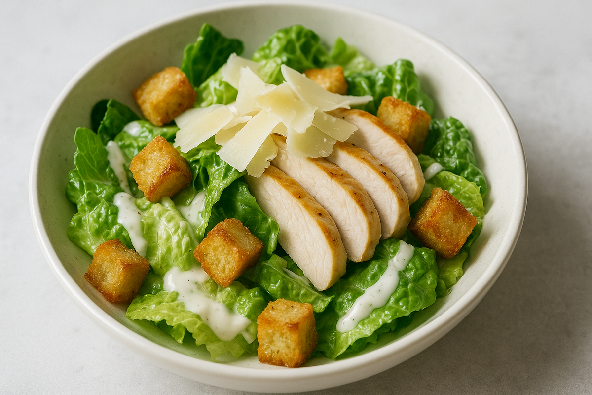 Лёгкая версия классики с насыщенной заправкой. Секрет — йогуртовая основа с анчоусом и пармезаном за 2 минуты. 15 минут • 2–3 порции • без майонеза Пошаговый рецепт из доступных продуктов: Ингредиенты: 1) Куриное филе — 250 г 2) Салат ромэн/айсберг — 1 кочан 3) Хлеб для крутонов — 2 ломтика 4) Пармезан — 40 г 5) Йогурт натуральный — 120 г 6) Анчоусы — 2 филе 7) Горчица — 1 ч. л. 8) Лимонный сок — 1 ст. л. 9) Чеснок — 1 зубчик 10) Оливковое масло — 1 ст. л. 11) Соль, перец Приготовление: 1) Поджарить крутоны. Кубики хлеба обжарьте на сухой сковороде до золотистости; в конце сбрызните маслом. 2) Обжарить курицу. Филе разрежьте вдоль, посолите, обжарьте по 2–3 минуты на стороне до готовности, остудите и нарежьте. 3) Сделать соус на йогурте. В чаше блендера измельчите йогурт, анчоусы, горчицу, лимонный сок, чеснок и щепоть перца до крема. 4) Подготовить салат. Листья вымойте и обсушите, порвите руками на крупные куски. 5) Собрать салат. Смешайте листья с половиной соуса, добавьте курицу и