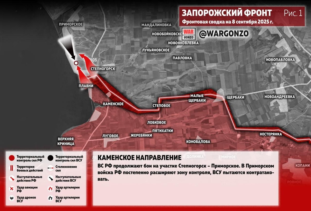 Запорожский фронт ВС РФ продолжают бои на участке Степногорск – Приморское. В Приморском войска РФ постепенно расширяют зону контроля, ВСУ пытаются контратаковать. (Рис. 1) Донецкий фронт На Южно-Донецком направлении фиксируется продвижение в районе Тернового: по сведениям источников, войска РФ вышли на окраины села. Минобороны РФ сообщило об освобождении Хорошего. Идут бои за Сосновку. (Рис. 2.1) На Покровском направлении войска РФ заходят на северо-восточную окраину Мирнограда. Продолжаются сражения за Молодецкое и в районе Удачного. На Добропольском участке ВСУ активно контратакуют. Идут бои по линии Никаноровка – Кучеров Яр. Сообщается, что восточнее ВС РФ заняли центр села Шахово. (Рис. 2.2) На Краснолиманском направлении, по данным источников, ВС РФ держат под контролем большую часть Шандриголово. Противник контратакует в районе Новомихайловки. На Северском участке ВС РФ наступают в Серебрянском лесу, расширяя зону контроля. Продолжаются бои у Выемки, фиксируется продвиже