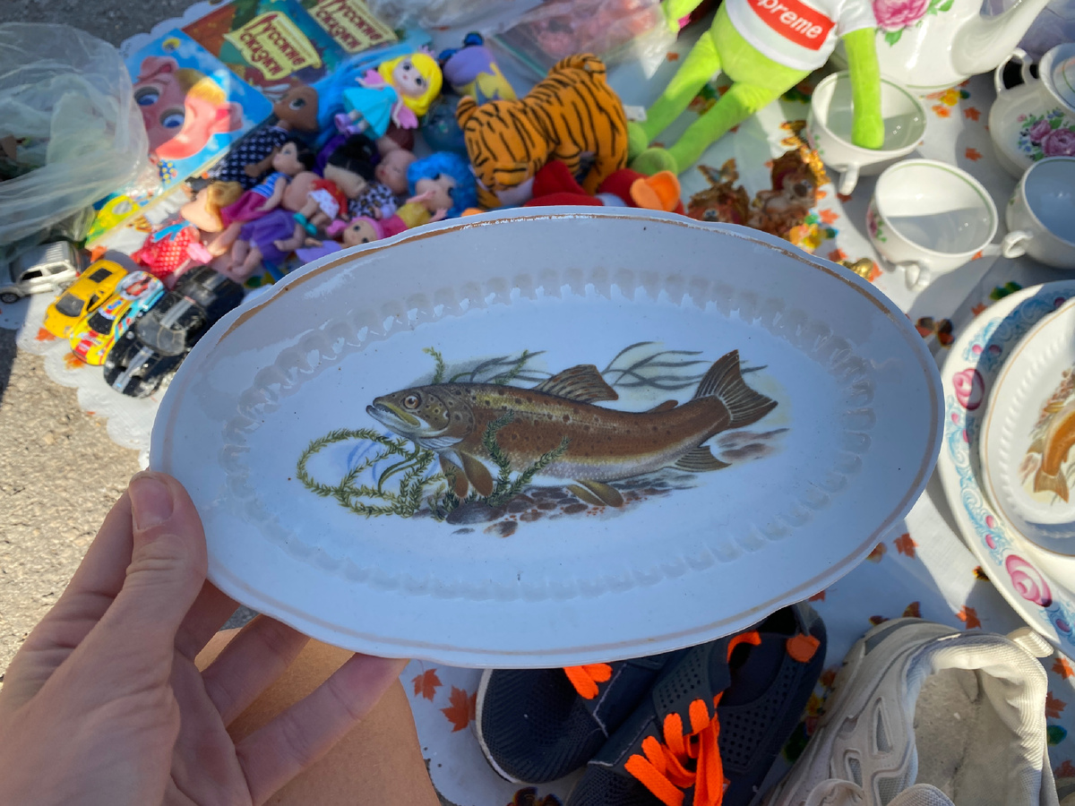 С легкой грустью приходится осознавать, что лето закончилось. И не только потому, что юбки и сарафаны придется убрать, а герани выкопать и забрать на зимовку домой. Барахолка скоро тоже обеднеет. Оно и понятно, кому охота стоять на холоде полдня. Останутся сильнейшие😁 И продавцы, и самые стойкие покупатели. Но пока погода позволяет, идем смотреть, чем торговали в самом конце лета на тульском блошином рынке. Кто-то удачно наловил Пролетарских рыбОВ. Муж (заядлый рыбак) угадал здесь форель. Были очень душевные и трогательные березовые веточки Вербилок. Опять попадается эта форма с рельефным рисунком в виде вытянутых округлых пластин, которую я не в силах опознать. Пара - 250₽ Из тяжелой артиллерии нашла красивые тарелки с клеймом Всеукртрест (фарфор-стекло-фаянс), созданным в 1922 году и проработавшем до 1934 года. Вполне себе антиквариат. Рисунок красив, благороден, приятного патиново-зеленого цвета. Горошков много всегда, а вот «Дороги» Вербилок на форме Ручеек не часто встречаются.