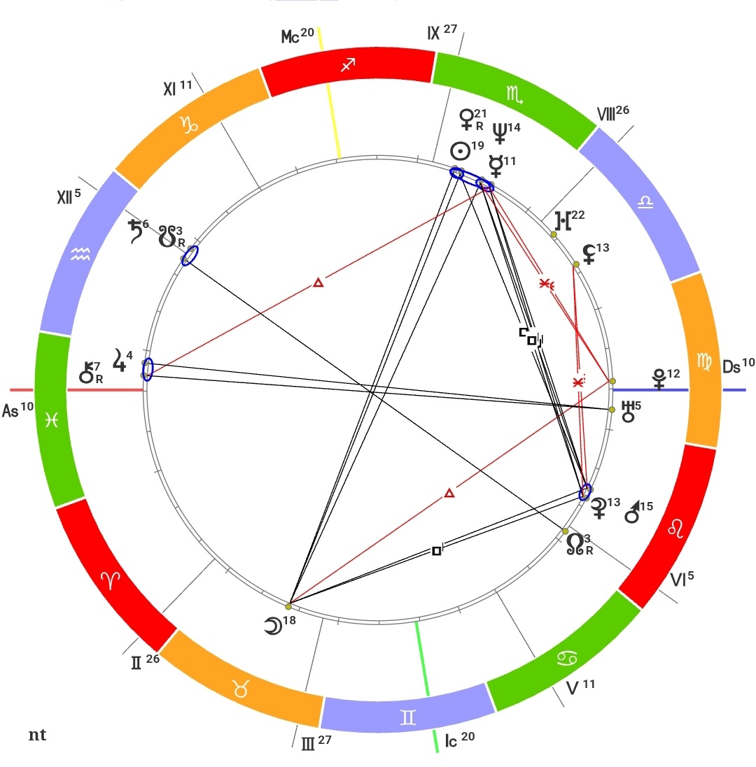 Помимо Скорпиона её гороскоп демонстрирует ещё одну характерную особенность: два мощных Тау-квадрата . Главный Тау-квадрат связывает трио Солнце-Венера-Нептун (однако мы не включаем Меркурий из-за его слишком большой орбис), образуя квадрат с Марсом во Льве и оппозицию к Луне в Тельце. Можно подытожить, что эта конфигурация выражается внутренними конфликтами между потребностью в простых и естественных чувствах (Луна в Тельце) и бурной энергией, в том числе сексуальной, а также склонностью Скорпиона к разрушению или созданию проблем.