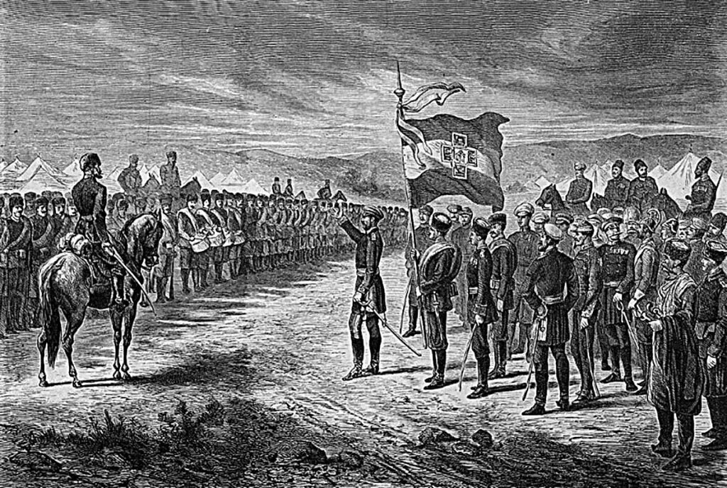 30 апреля 1876 года в самарской прессе было опубликовано сообщение о начале вооруженного восстания болгарского народа против османского ига. А 5 июня в городской думе был создан комитет по сбору средств в помощь восставшим. Возглавил его управляющий палатой государственных имуществ Петр Алабин. Узнав, что у повстанцев нет боевого знамени, монахини Иверского монастыря при участии супруги Алабина Варвары Васильевны изготовили знамя, сшитое из трех полотнищ — красного, белого и синего. На нем — украшенный богатым орнаментом крест. В его центре — копия чудотворной иконы Иверской Богоматери. На обороте — фигуры отцов славянской письменности Кирилла и Мефодия. Эскиз знамени создал художник Николай Симаков — большой знаток орнаменталистики, проживавший в то время в нашем городе. Серебряный наконечник флагштока выполнен в византийском стиле по эскизу графа Николая де Рошфора. Этот столичный архитектор в 1876 году как раз заканчивал в Самаре строительство железнодорожного вокзала. На позолоченн