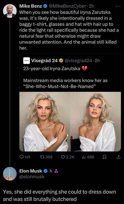 Musk notes beautiful Iryna 'did everything to dress down & still brutally butchered